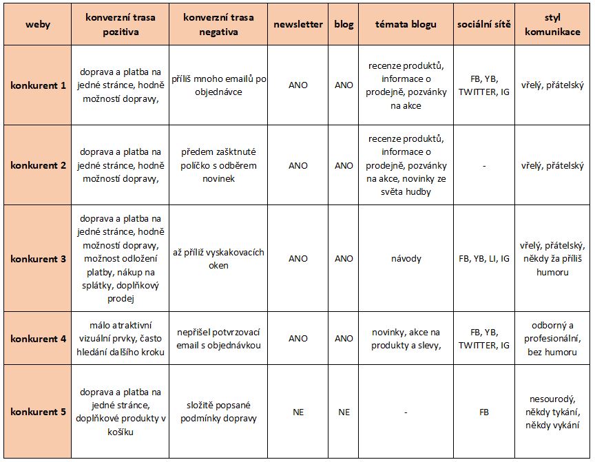Při podrobnější analýze webů s gramofony jsme zjistili, že většina prodejců jsou specialisté, kteří mají vlastní poslechová studia a kamenné prodejny. Téměř všichni používají newslettery a mají sociální sítě. Některé weby mají dokonce stejného majitele (což už víme z webu justice.cz).